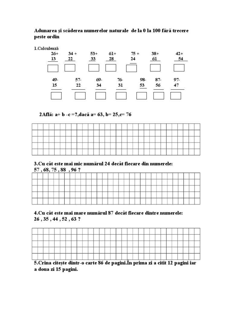 Adunări și Scăderi Cu și Fără Trecere Peste Ordin 0 100 Fișe De