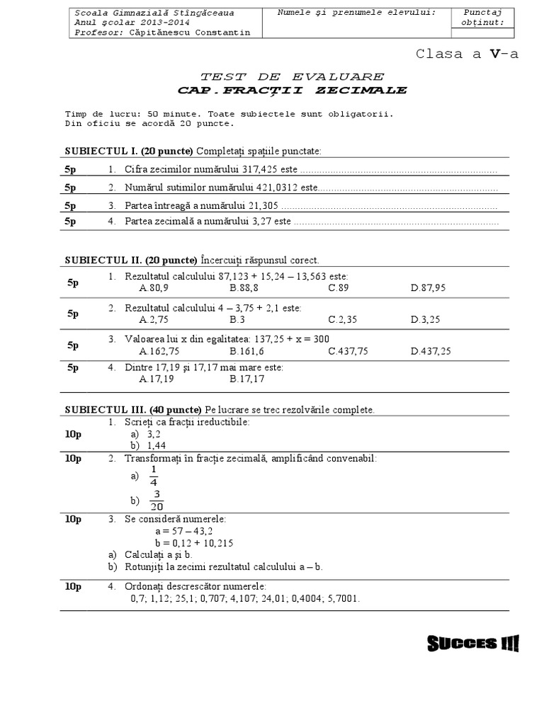 Test Operatii Cu Numere Zecimale Clasa A Va Pdf Document