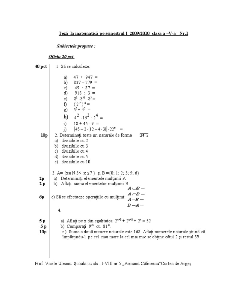 Teza Matematica Clasa 5 Sem 1 Varianta 2 Matematică Invățare